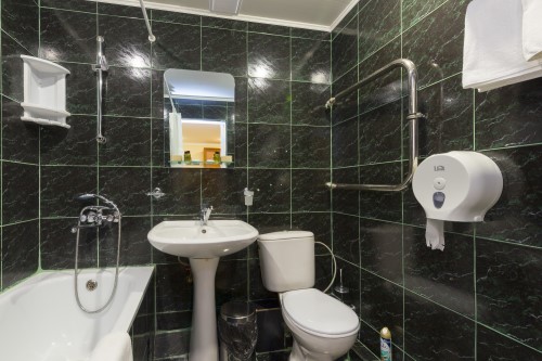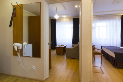 Площадь номера - 30-32 кв.м. 2 осн. места. 2 доп. места. Мебель: вешалка, зеркало, кровать двуспальная, набор мягкой мебели, прикроватные тумбочки, столик туалетный, стулья, тумба, шкаф, шкаф для посуды. Оборудование: сейф, телевизор, телефон, холодильник, чайный набор посуды, электрочайник. Санузел: с ванной, фен. Сервис: смена полотенец (1 раз в 7 дней), смена постельного белья (1 раз в 7 дней), уборка номера (ежедневно), услуги внутренней телефонной связи.