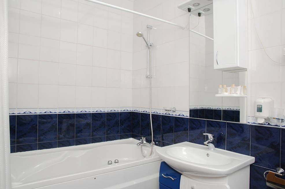 Площадь номера - 30-32 кв.м. 2 осн. места. 1 доп. место. Мебель: вешалка, зеркало, кровать двуспальная, набор мягкой мебели, прикроватные тумбочки, столик туалетный, тумба, шкаф, шкаф для посуды. Оборудование: сейф, телевизор, телефон, холодильник, чайный набор посуды, электрочайник. Санузел: с ванной, туалетные принадлежности, фен. Сервис: смена полотенец (1 раз в 7 дней), смена постельного белья (1 раз в 7 дней), уборка номера (ежедневно), услуги внутренней телефонной связи.